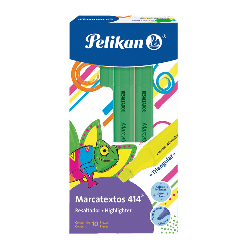 Caja con 10 marcatextos 414 de cuerpo delgado, con punta plástica biselada.